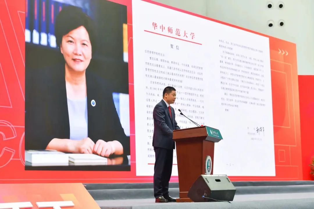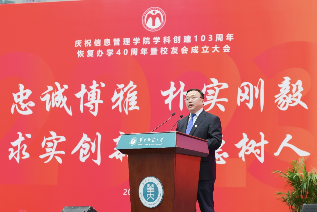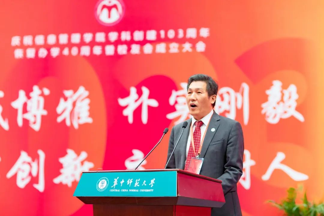 华中师范大学党委书记夏立新代表学校向信息管理学院学科创建103周年、恢复办学40周年暨校友会的成立表示祝贺,向关心和支持信息管理学院发展的友好单位和各界朋友表示感谢,向为学院发展做出卓越贡献的前辈致以敬意。在致辞中,他回顾了信息管理学院的办学历程,对一代代信管人自信自强、守正创新给予高度肯定。