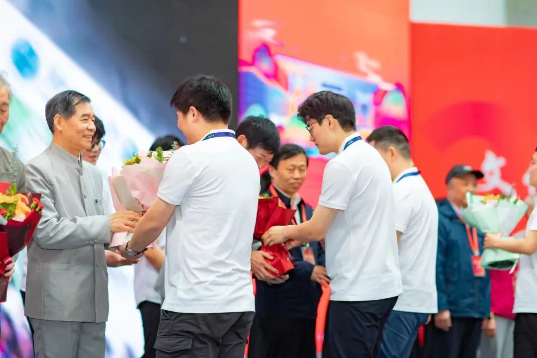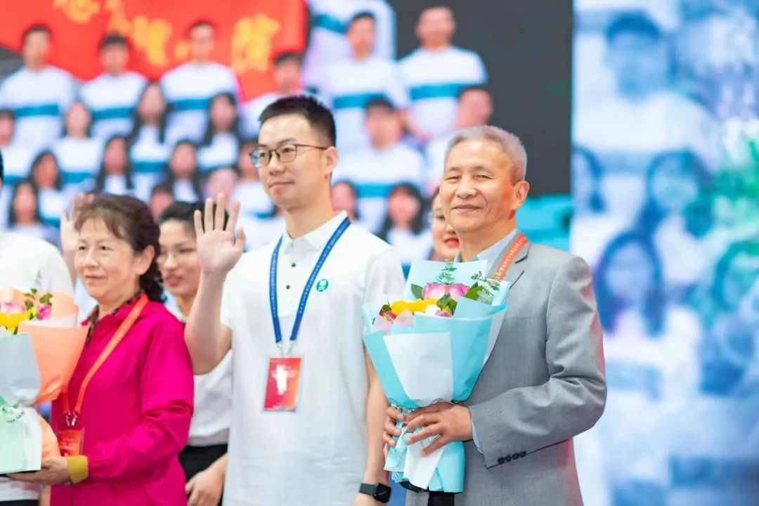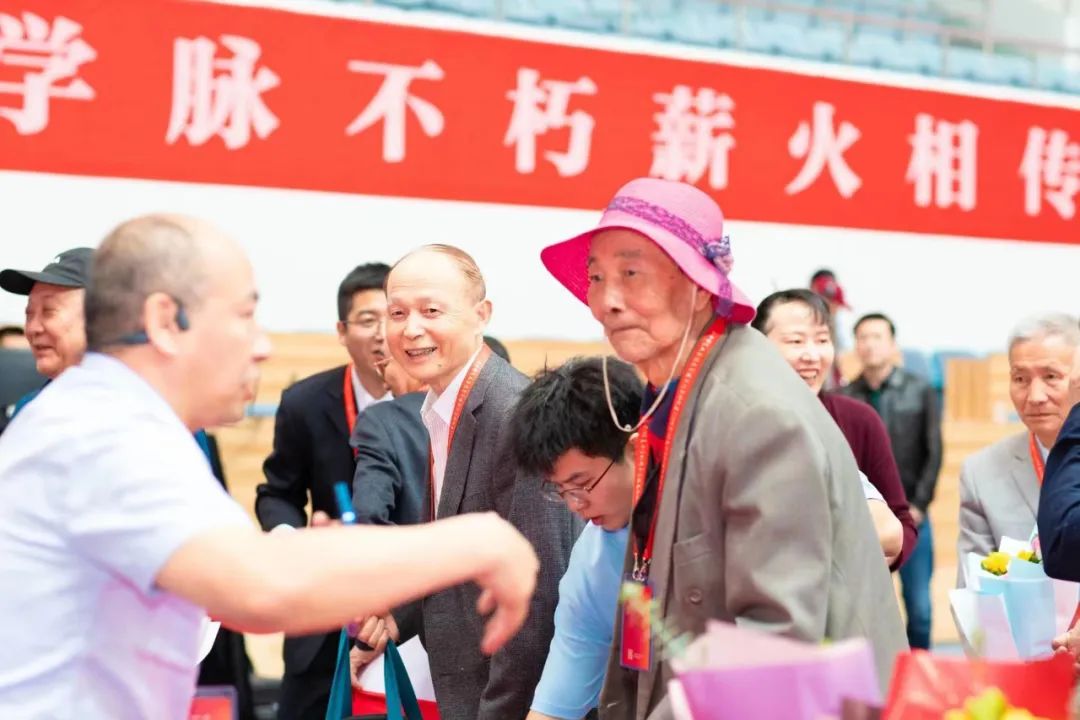 青年教师代表为退休教师献花致敬,感谢他们为学院事业发展做出贡献