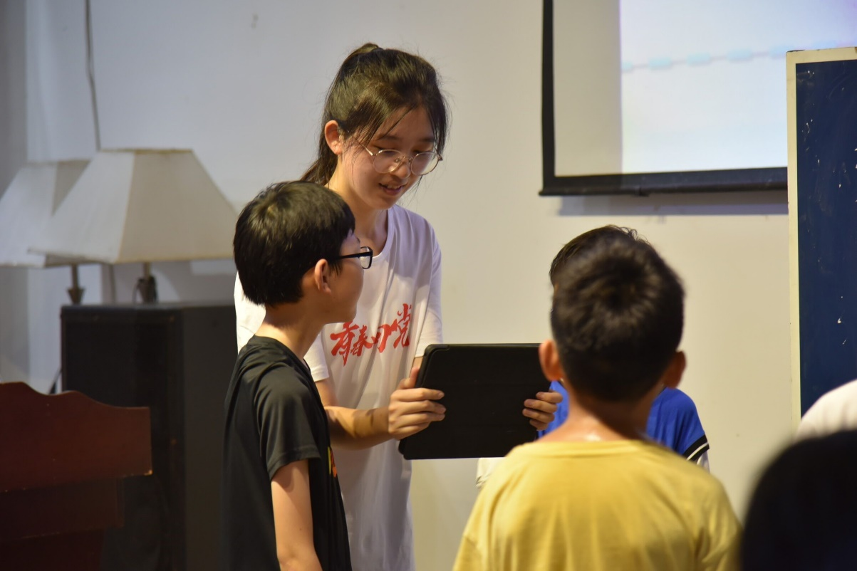 欢声笑语中,学生们在进行画画接龙小游戏。孩子们比划着传达信息,希望下一个人能够猜出所给词,但在传递过程中不免会出现错判。在这个寓教于乐的过程中,轻松愉快的游戏同样蕴含着知识:信息的传递非常重要,影响着最终信息的真实性。一旦某一环节出现问题,最终结果就会有偏差。