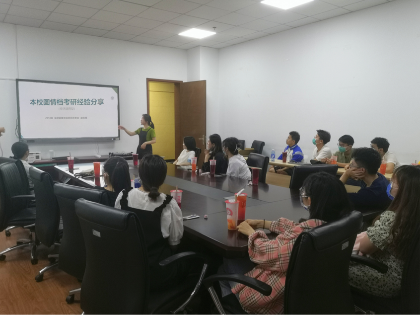 随后是龙秋易的分享。她是18级信息管理与信息系统专业的学生,上岸本校图书情报与档案管理学硕。龙秋易首先强调了“考研的选择>努力”的观点,她通过自己身边朋友考研目标院校较高,虽然加倍努力最后还是被调剂的例子,劝诫大家在考研之前,一定要根据自己的兴趣和能力选择适合自己的学校和专业。她的分享主要从学硕初试的四个科目入手,为大家详细介绍了各科重点、复习时间以及推荐的资料,同学们都收获颇丰。在总结经验时,龙秋易建议大家做好信息搜集,增强自己的沟通表达能力,为面试做好准备。