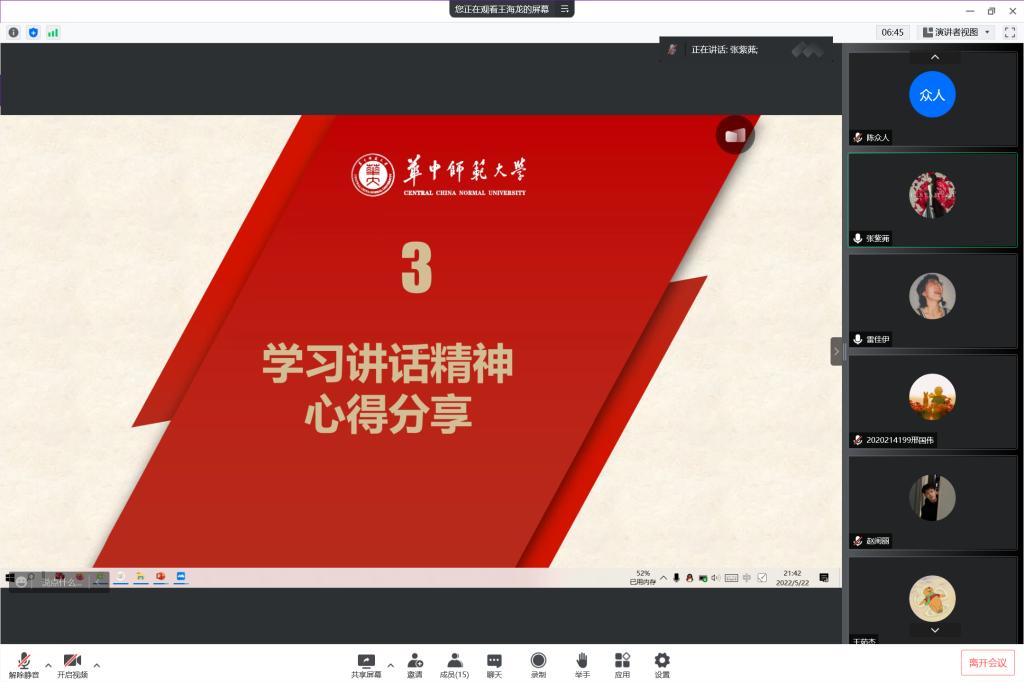 最后是感悟交流环节。尹熙同学和张紫茀同学分别向大家分享了自己听讲和观看相关视频之后的感受。尹熙感叹在团的百年征程中,青年始终与国家同频共振:民族危难之际,他们冲锋陷阵,砸碎旧世界,热血燃光明;建设新中国时期,他们勇挑重担,怀赤子之心,建雄伟大厦。而张紫茀则想到了在前不久结束的北京冬奥会上,中国体育健儿奋勇拼搏,迎难而上,创造了中国冬奥的最佳战绩。青年勇敢、坚强、果决的精神面貌,是对建团百年最好的礼赞。