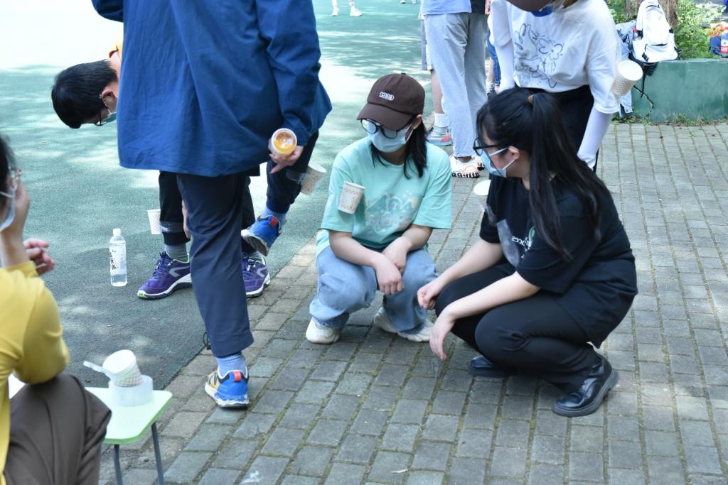 此次趣味运动会共有袋鼠跳接力、乒乓球接力、齐心协力、神射手、一百米折返跑以及别惹气球六项活动。在正式游戏开始之前,主持人组织同学们按分配的小组站队,并简单介绍了此次活动的规则。各小组在原地进行简单商讨之后,确定了自己的活动路线,趣味运动会就此拉开序幕。趣味运动会的各项活动从不同方面考验了各团队的协作、团结、速度、弹跳力、思维能力以及战略布局能力,在团队人数和活动规则相同的情况下,如何又快又准地完成各项活动,是取得胜利的关键。乒乓球接力以及别惹气球两项活动都着重考验了团队的协作能力。在乒乓球接力中,团队成员自行选择将纸杯粘贴在手臂或腿上,从第一个人开始,把乒乓球放入纸杯中,将乒乓球倒入下一个人的纸杯即可完成一次接力。第一小组中相邻的三位同学都选择将纸杯粘贴在腿上,在第一次交接时,前两位同学选择了同时蹲下,杯口相挨,在其他队员的协助下让球进入下一位同学的纸杯中。在第二次交接中,两位同学选择一站一蹲的方式,使球自然落入下一位同学的纸杯中。别惹气球项目则是需要团队成员在不让气球爆炸的情况下,夹住尽可能多的气球。