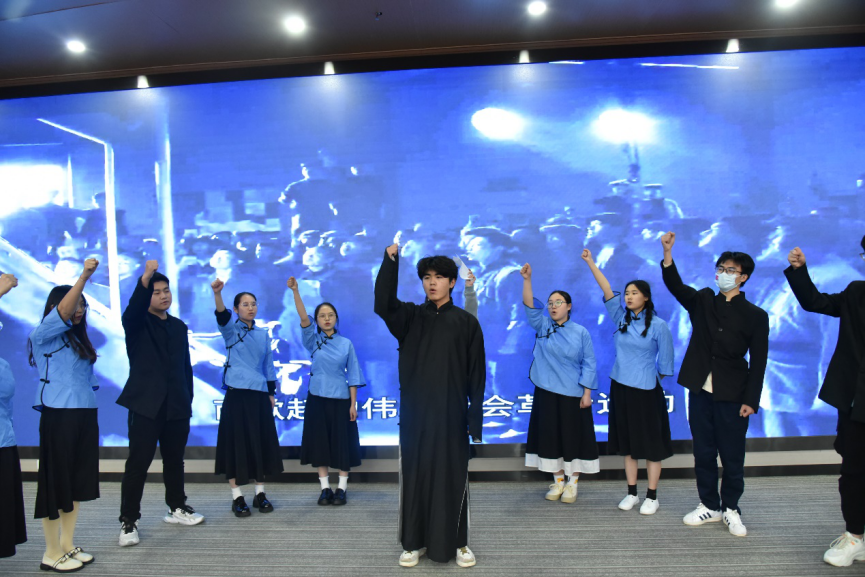 “我和我的祖国,一刻也不能分割。”2105团支部的《我和我的祖国》大合唱歌声昂扬;2103团支部的影子情景剧《小乐的返乡助农之路》结合专业特色,讲述了优秀人才小乐运用所学带领村民们通过电商实现脱贫的故事。《百年建团栉风沐雨,五四精神“信”火相传》,从五四青年运动穿梭至全民抗疫,2106团支部带来的舞台剧热血沸腾,充分体现了中国共产党人一心为国、舍己为人的精神。“我将无我,不负华夏!”在《逐红船浪花,染信念之魂》中,2102团支部成员挥舞手中的红丝带,用舞蹈讲述了红船会议的故事。精彩纷呈的表演形式让在场的观众们赏心悦目,掌声不断。