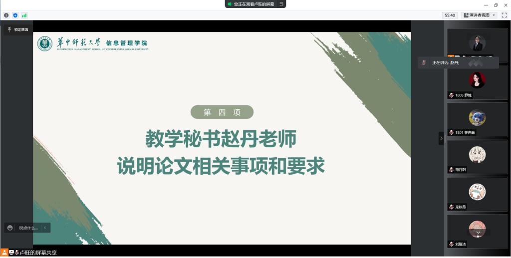 为了进一步做好我院本科毕业论文指导工作,提高学生毕业论文质量,2022年4月24日早上10:00,信息管理学院线上召开“一起向未来”毕业指导系列活动——毕业论文指导会,针对毕业论文相关问题进行指导。信息管理学院副院长卢新元、党委副书记王涛、系主任陈静、教学秘书赵丹、辅导员卢旺及2018级全体本科生参加本次线上会议,会议由辅导员卢旺主持。