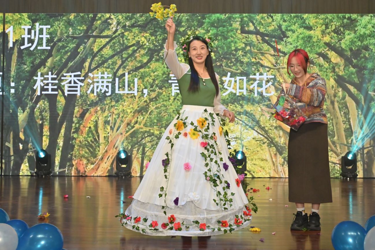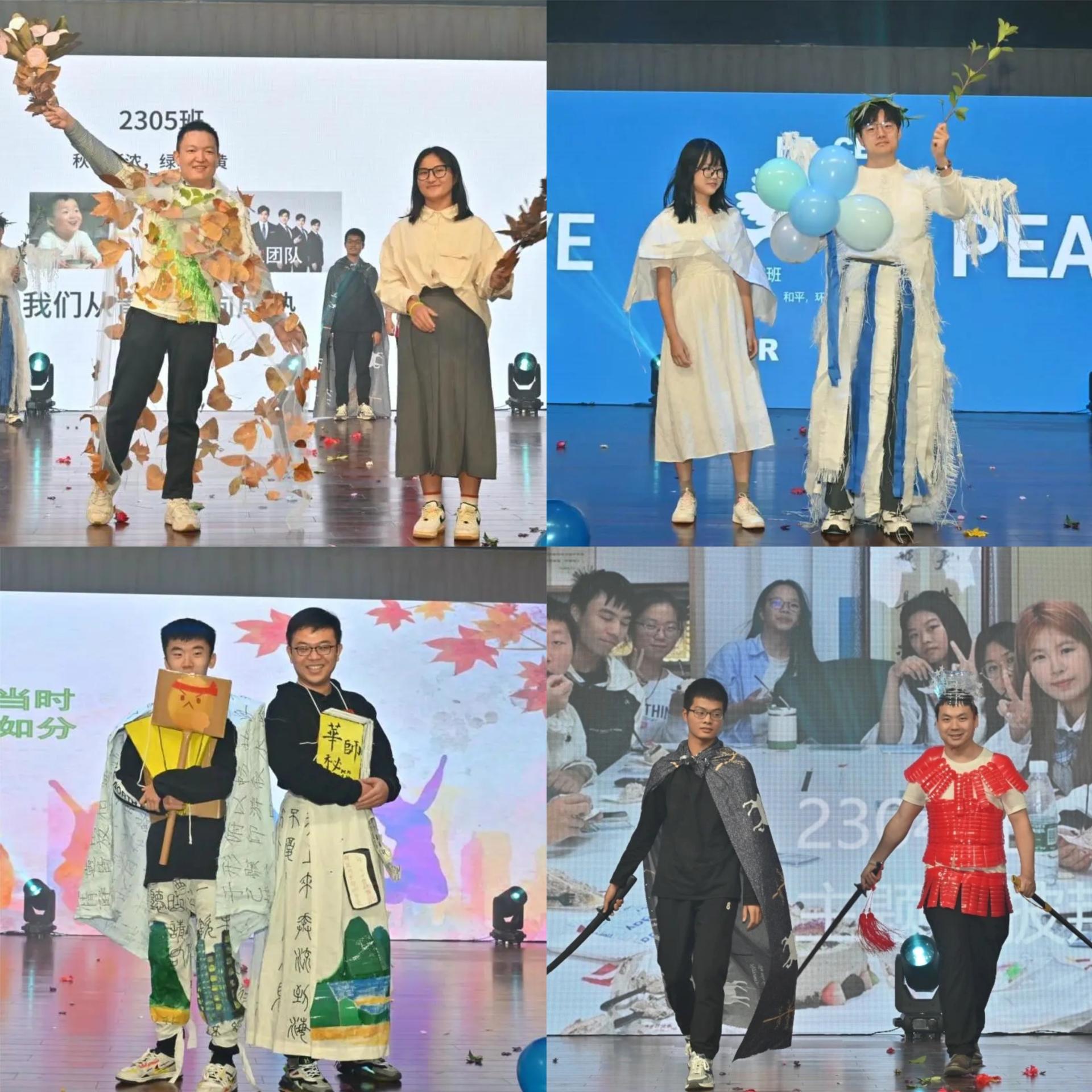 以《嗨!新同学》为名的班级创意服装秀,以环境保护为主题的服装设计理念,将晚会推向了第一个高潮。各班班主任在本班同学的陪伴下,穿着由班级成员用塑料袋、纸壳、矿泉水瓶、落叶、落花等材料精心制作的创意服装,依次走上舞台。优雅精致风,简朴大气风,创意幽默风……各种奇思妙想轮番上阵,让人大开眼界,现场观众的投票环节和拉票环节更是精彩绝伦,各显神通,最终,2306班拔得头筹。