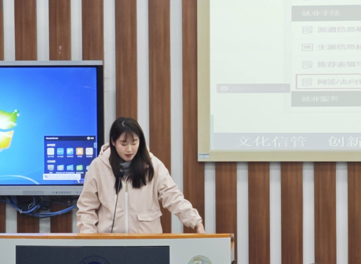 晚点名伊始,辅导员刘瑾洁详细解读了华中师范大学就业信息网的操作流程和就业相关政策。她强调了毕业去向登记以及就业信息推荐表的重要性,并就网上签约的注意事项进行了详细讲解。