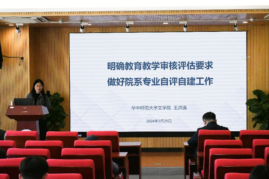 王洪涌教授首先根据自身审核评估工作经验以及对认证和评估要求的理解,结合文学院的本科教学和管理工作,与我院教职员工探讨了迎接新一轮本科教育教学审核评估工作的方法。