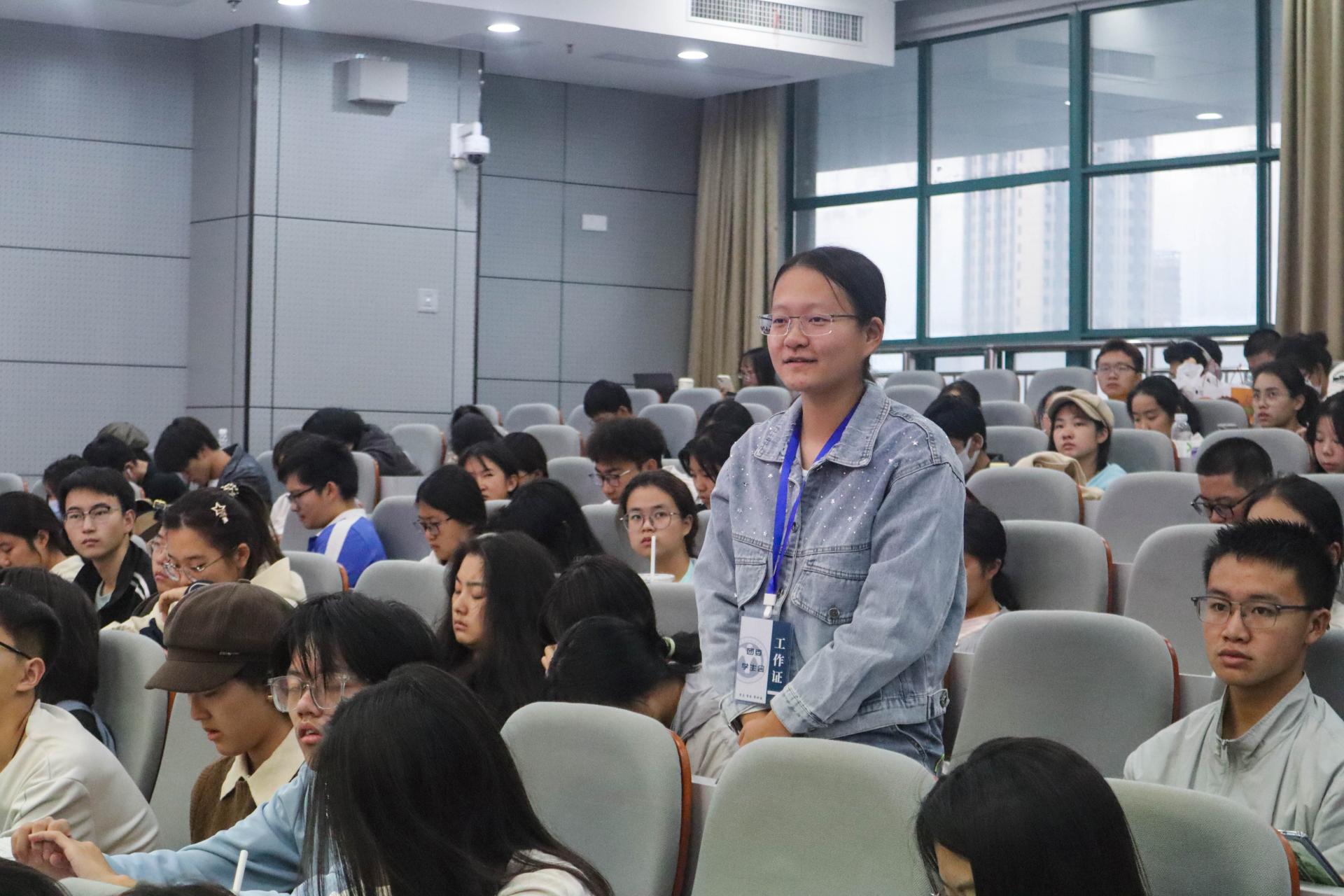 在提问环节,同学们对创新创业比赛表现出浓厚兴趣,踊跃提问。陈小楠结合丰富的创赛经验,就选题确定、学业和竞赛平衡以及团队组建等问题,提供了宝贵的见解和建议。