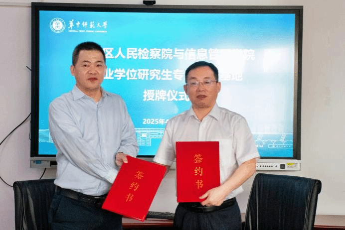 在双方参会人员见证下,双方签署了专业实践合作协议。随后,双方共同为“华中师范大学信息管理学院—武昌区人民检察院专业学位研究生专业实践基地”揭牌。