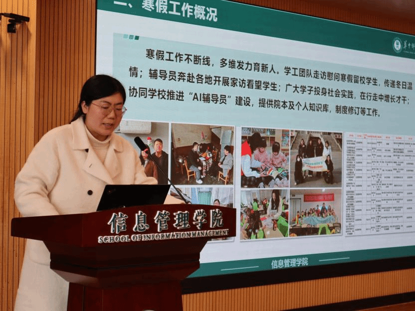 党委副书记蒋可鸣简要回顾寒假工作,介绍当前学生工作队伍、学生返校报道、2026届毕业生就业和开学工作情况,明确新学期将聚焦辅导员队伍建设、日常管理、制度修订、学风建设、生涯教育、就业推动等重点工作,扎实做好“有温度的教育”。