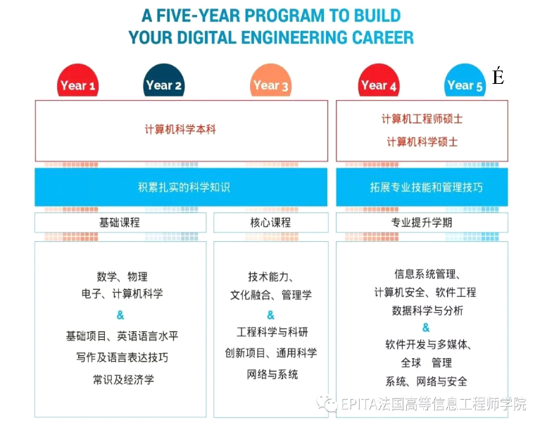 成立于1984年的EPITA法国高等信息工程师学院 (Ecole Pour l'Informatique et les Techniques Avancees)是计算机科学和软件工程领域全法排名第一的、提供英法双语教学的顶尖工程师学院。学院提供从本科到硕士阶段、针对不同专业方向的英语授课课程,每年招收数百名国际学生前来就读。面对数字化革命的时代浪潮,EPITA为培养引领数字革命、适应全球化挑战和实现技术创新的数字工程师而不懈努力着。