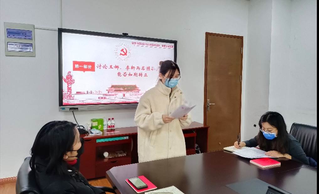 会议第一部分,讨论王娜、李轩两名预备党员能否如期转正。首先由王娜、李轩同志汇报预备期内各方面情况。王娜同志从思想政治、入党初心、学习、生活等各方面详细汇报了自己在预备期间的进步与不足,入党初心不断坚定,把理论学习当作一种自觉,专业学术水平不断提高,在毕业论文选题上深入研究,同时积极参与志愿服务,关心同学,表达了其转正的志愿和决心;李轩同志从思想、学习和个人生活三个方面阐述了自己在预备期间内的变化,通过阅读《毛泽东选集》,对利益和社会主义的认识发生了转变,能够在舆论场中保持清醒头脑,在备考国家公务员考试中提升思维能力、计算水平和语言表达能力,在生活中能以更加平和稳定的心态面对生活中的坎坷或成功,同时表达了自己的不足,以及转为正式党员的强烈期望。
