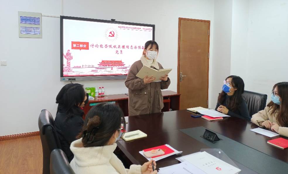 会议第二部分,讨论能否吸收吴瑾同志为预备党员。首先由发展对象吴瑾同志汇报相关情况,表明入党动机,她汇报了自己自成为入党积极分子以来在思想、学习、工作、生活中取得的进步,同时也对当前个人情况做了进一步总结,该同志认为自己虽然学习态度端正、目标明确、乐于学习新知识,但是也存在比较明显的短板,比如缺乏社会经验,考虑事情不全面,理论知识不扎实,并表示会在未来的实践中不断完善自己,以党员标准严格要求自己,虚心向身边的优秀党员同志们学习,争取取得更大的进步。