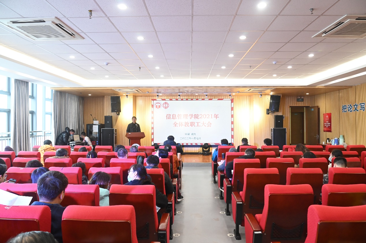 (通讯员 谢铭虎 张宁)为更好地总结过去,展望未来,凝心聚力推动学院教学科研事业发展迈向新台阶,绘就新蓝图。2022年1月7日下午14:10,信息管理学院2021年全体教职工大会于南湖综合楼N10001学术报告厅顺利召开。会议由信息管理学院党委副书记王涛主持,参会人员有信息管理学院党委书记王雨露、院长李玉海及学院全体教职工。
