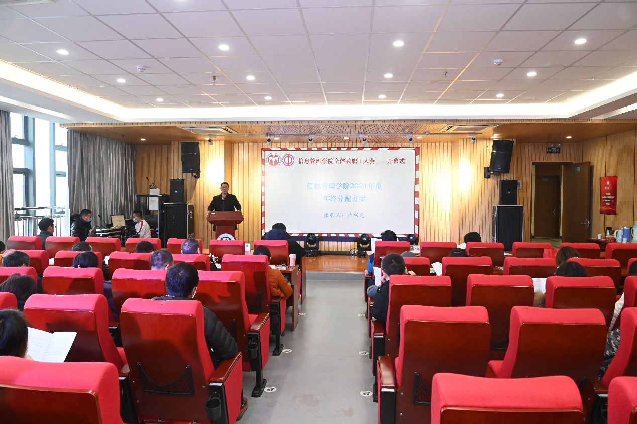 会议第四项,卢新元副院长就信息管理学院2021年度年终分配方案进行汇报。卢新元副院长从基础绩效、奖励绩效、行政人员绩效、管理人员绩效等方面对分配办法做了详细的说明。卢新元副院长指出分配工作要体现绩效、体现差异性,与会教职工反响热烈。
