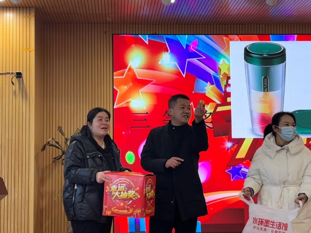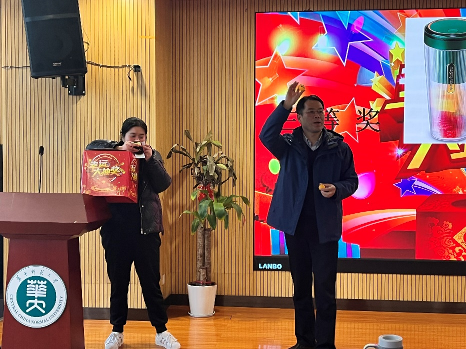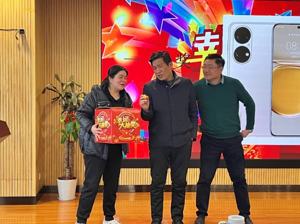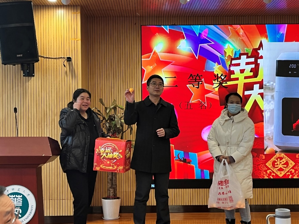 为弥补去年因疫情未举办的联欢会,工会还筹备了抽奖环节,并为大家准备了丰盛的奖品。抽奖共三次,在每组有奖竞猜后进行。抽奖环节氛围欢快,大家都在期待大奖花落谁家。最终,薛莲老师和张自然老师获得了幸运的一等奖,由王雨露书记和李玉海院长为其抽取并颁发奖品。