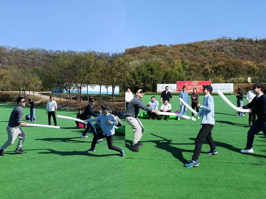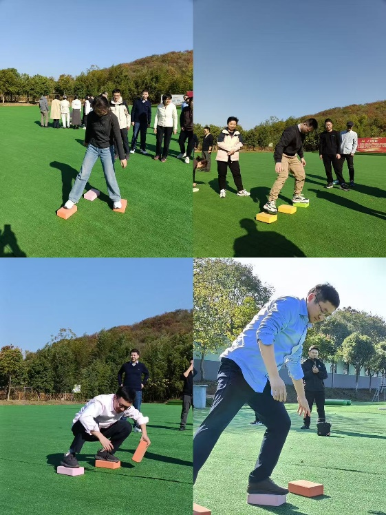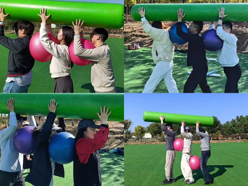 摸石头过河游戏中,老师们手脚并用,小心翼翼地移动着“石头”,既要保证速度,又要维持身体平衡,团队成员们在一旁加油助威,现场气氛紧张而热烈;蚂蚁搬家项目里,老师们分工明确、配合默契,将“食物”快速而有序地搬运回 “巢穴”,充分展现了团队协作的力量;蒙眼互打游戏则充满了趣味性与挑战性,蒙眼的老师在队友的指挥下,挥舞着手中的“武器”,努力击中目标,引得旁观者忍俊不禁。