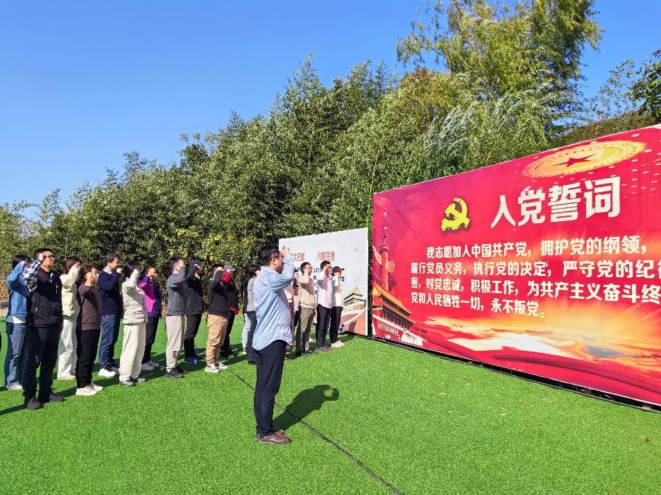 抵达目的地后,全体党员教职工在学院书记的带领下,庄严重温入党誓词。面对鲜红的党旗,党员们高举右拳,庄严宣誓,铿锵有力的誓言回荡在空气中,让每一位党员重新坚定了自己的初心与使命,增强了党性观念和党员意识,也为本次活动注入了庄重而深刻的内涵。