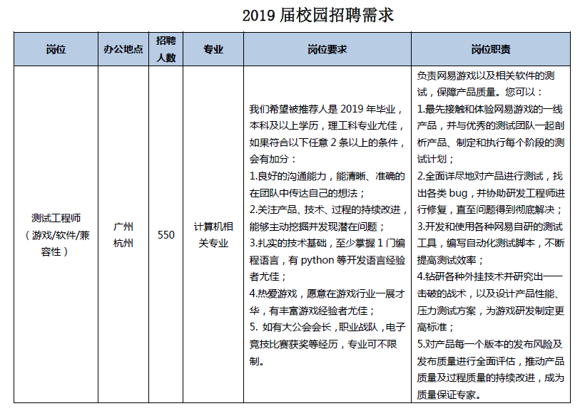 广东南油对外服务有限公司(简称“南油外服”)希望与高校建立起良好对接的桥梁,2019届的校招岗位为“游戏测试工程师”,以上岗位将与广东南油对外服务有限公司签约,并外派到网易进行测试工作。