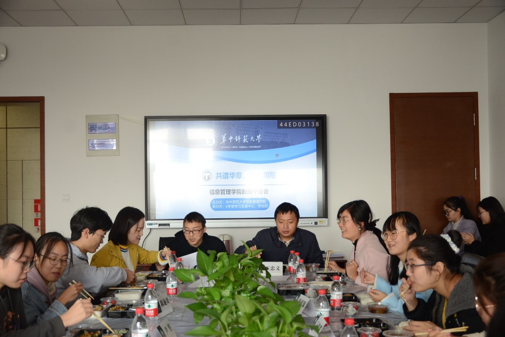 (通讯员 刘希月)11月18日中午,由信息管理学院“e学堂”学习发展中心承办的“共谱华章,驭梦翱翔”教授午餐会在10001、10002、10003和10006举行。参加本次午餐会的有党委副书记王涛、副院长卢新元、信息管理与信息系统系系主任陈静、大数据管理与应用系系主任叶光辉、信息资源管理系系主任王王忠义、电子商务系系主任张珺、信息管理与信息系统系老师陈烨、大数据管理与应用系老师武川、电子商务系老师王萍、信息资源管理系丁恒以及本科生辅导员蒋可鸣、肖丽霞、卢旺及34名同学。
