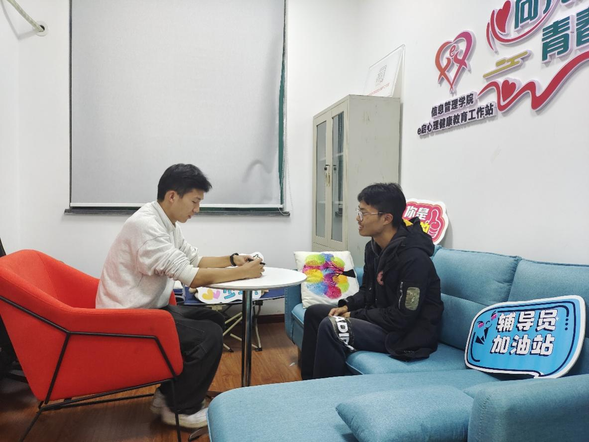 (通讯员 张柳萌 黄彦松 罗鸿奕)为了使辅导员更加深入了解22级新生学习生活情况,加强与新生的交流,帮助他们解决学习生活中的问题和困惑,以更加积极向上的姿态融入大学生活,由华中师范大学信息管理学院“e启心理健康教育工作站”和可鸣思政工作室主办的“辅导员加油站活动”由此开展。9月21日,第一阶段活动如期而至,辅导员蒋可鸣老师和兼职辅导员胡凯华老师同2022级新生刘浩然、黄绍博等同学展开了积极愉快的交流。