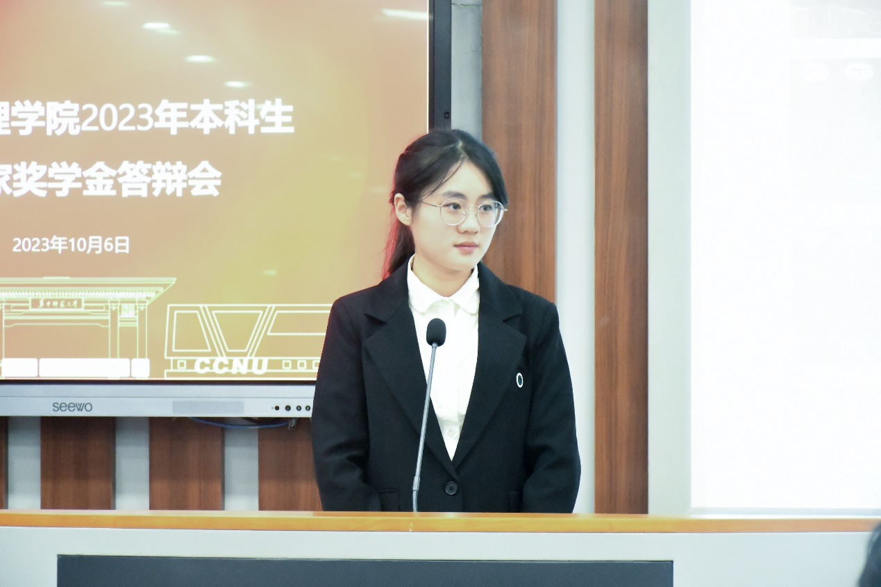 在前期个人申报,资格审核,民主评议的基础上,学院学生工作办公室差额确定参与答辩的候选人12名,其中2020级5人,2021级5人,2022级2人。候选人根据抽签顺序,分年级从思想政治、学习科研、社会实践、创新能力、综合素质等方面进行五分钟自我陈述,评委老师现场提问并评分,根据前期综合考察及现场打分情况,等额遴选5名拟获奖学生。
