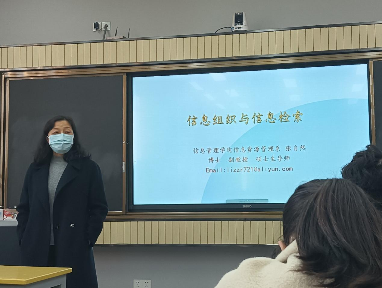 张自然向同学们作简要的自我介绍,对信息管理学院四个专业之间的关系与差异进行说明,让同学们更加了解信息资源管理专业。她向同学们解读信息资源管理专业人才培养方案中的课程体系部分,让同学们认识到信息组织与信息检索的重要性。